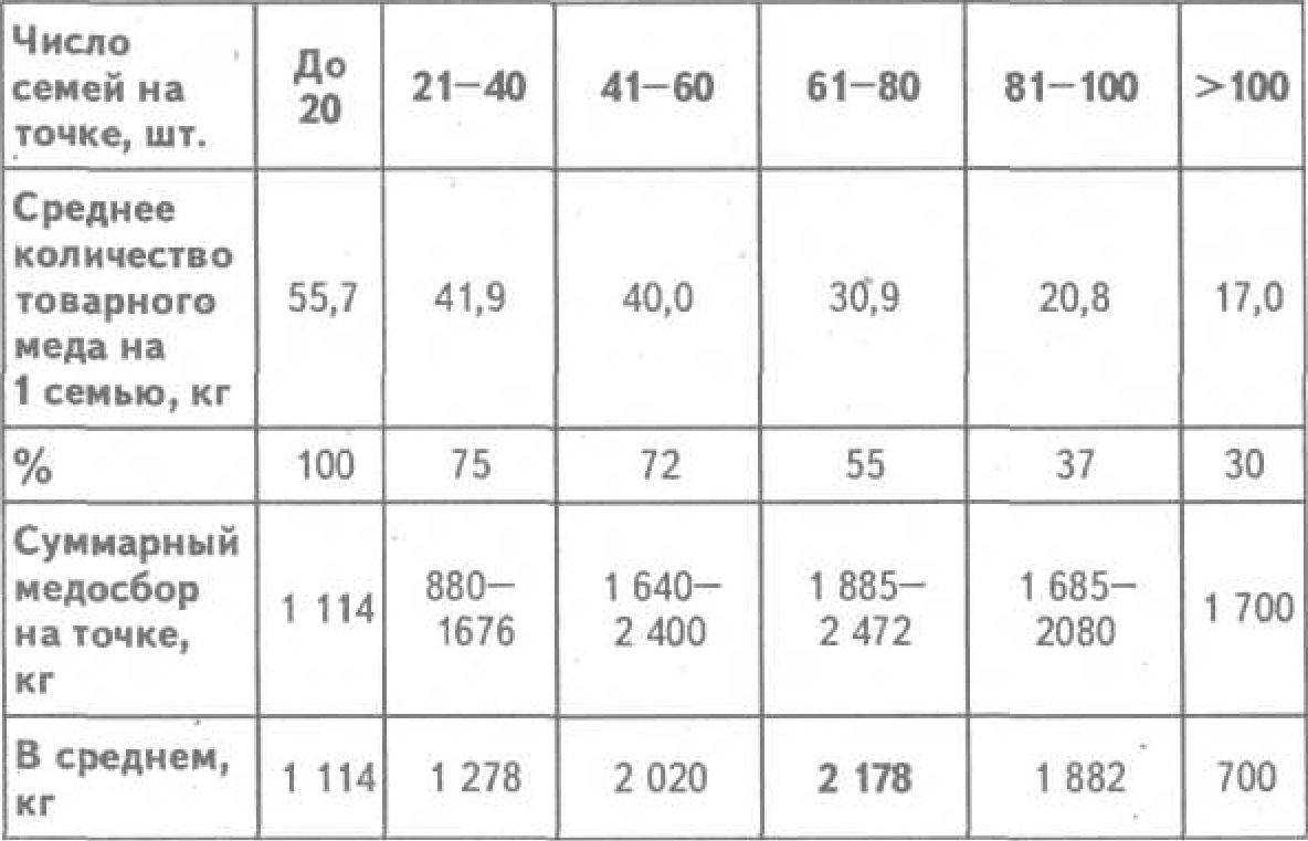 А. Малаю (1979) приводить таку залежність середньої кількості зібраного товарного меду від числа родин на одній крапці при незмінних медосборных умовах (табл. 1.7).