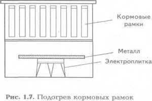 На цей корпус ставлять інший корпус, у який щільно поміщають кормові рамки. Верхній корпус накривають шматком фанери, ДВП і т.п. Хід підігріву треба обовязково контролювати й періодично виключати електроплитку, щоб не допустити перегріву рамок. Якщо ж є терморегулятор на необхідну потужність, то його треба використовувати. При цьому відповідне регулювання виставляють на підтримку під рамками температури не вище 35—36 °С.