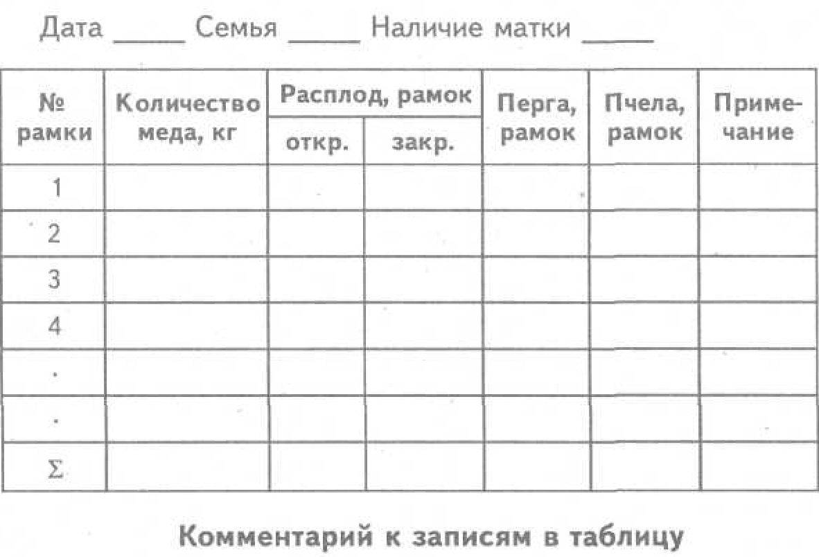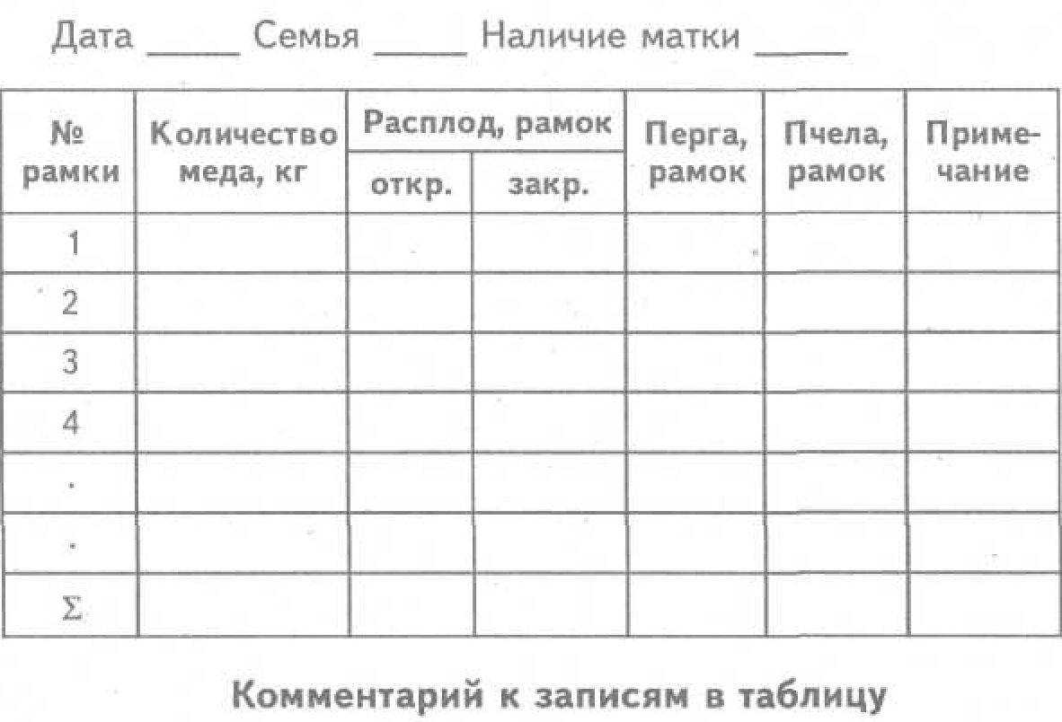 У процесі огляду, що краще проводити вдвох, роблять повні записи по кожній рамці. При цьому бджоляр займається оглядом, а помічник забезпеченням роботи й записами в таблицях, які він буде робити зі слів бджоляра.