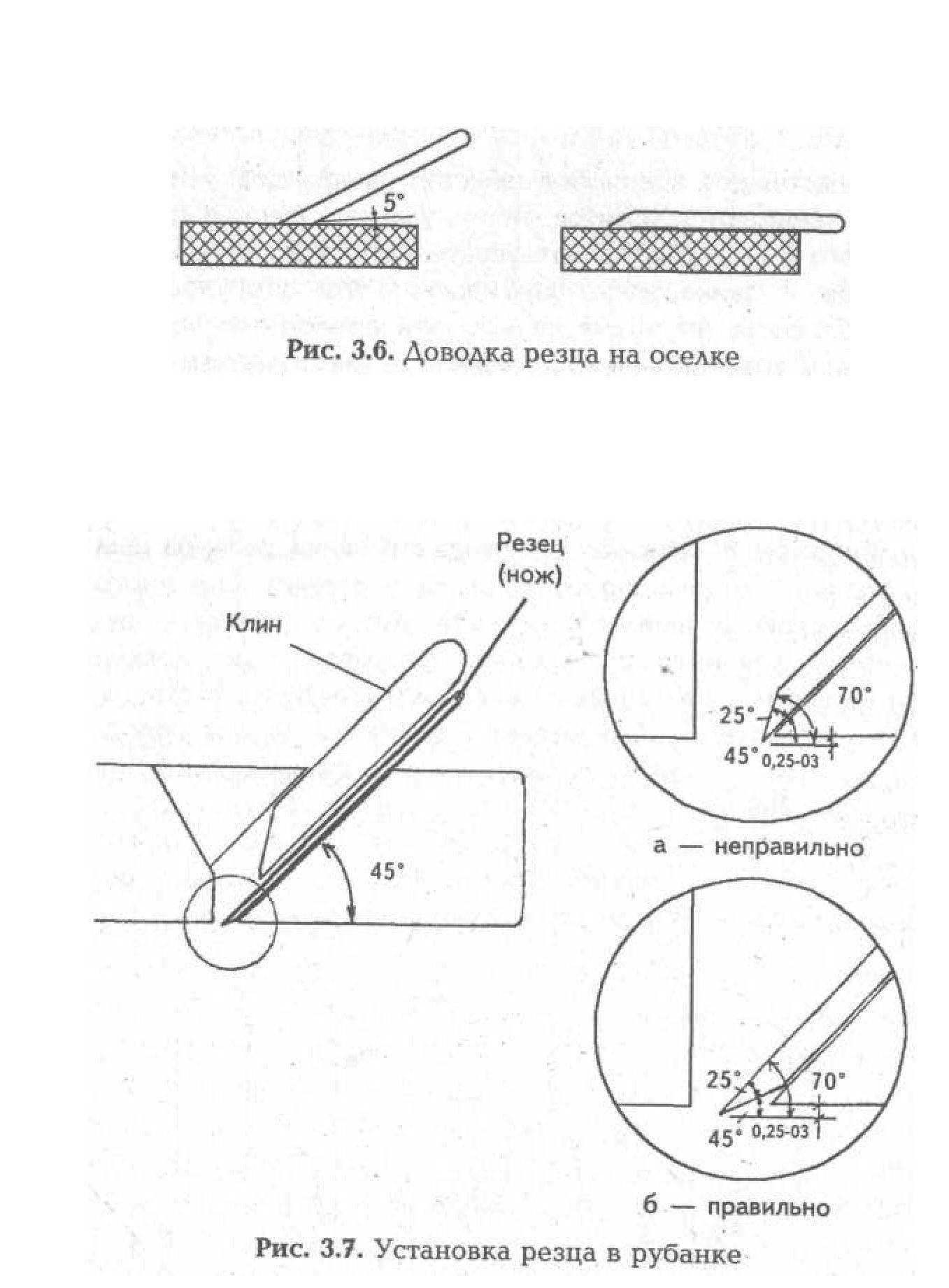 Жало різця повинне виходити за підошву колодки на 0,25—0,3 мм і проглядатися у вигляді рівної лінії при погляді на колодку з торця. Ніж чистіше повинна бути оброблювана поверхня й чим твердіше пиломатеріал, тим менше різець повинен виступати за підошву колодки рубанка. При правильній установці різця кут різання дошки буде оптимальним і становити 45° (рис 3.7, б). При цьому оброблювана поверхня дошки буде гладкої, без задирок і різець буде довго не затуплюватися. При установці різця фаскою вперед (як, втім, роблять багато хто), кут різання дошки не буде оптимальним і буде становити 70° (мал. 3.7, а). При такому куті різання фуговка буде відбуватися, однак умови різання не будуть оптимальними, тому оброблювана поверхня буде не суцільний, а з поперечними смужками, різець буде швидко тупитися.