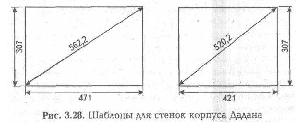 Після висихання заготівлі треба ще небагато подфуго-вать і після цього провести остаточну розмітку стінки. Найкраще це робити за допомогою найпростішого шаблона, що являє собою аркуш тонкого металу з точними розмірами необхідної стінки. Наприклад, для корпуса Дадана висотою 307 мм при товщині стінки 20 мм треба зробити два шаблони (мал. 3.28).