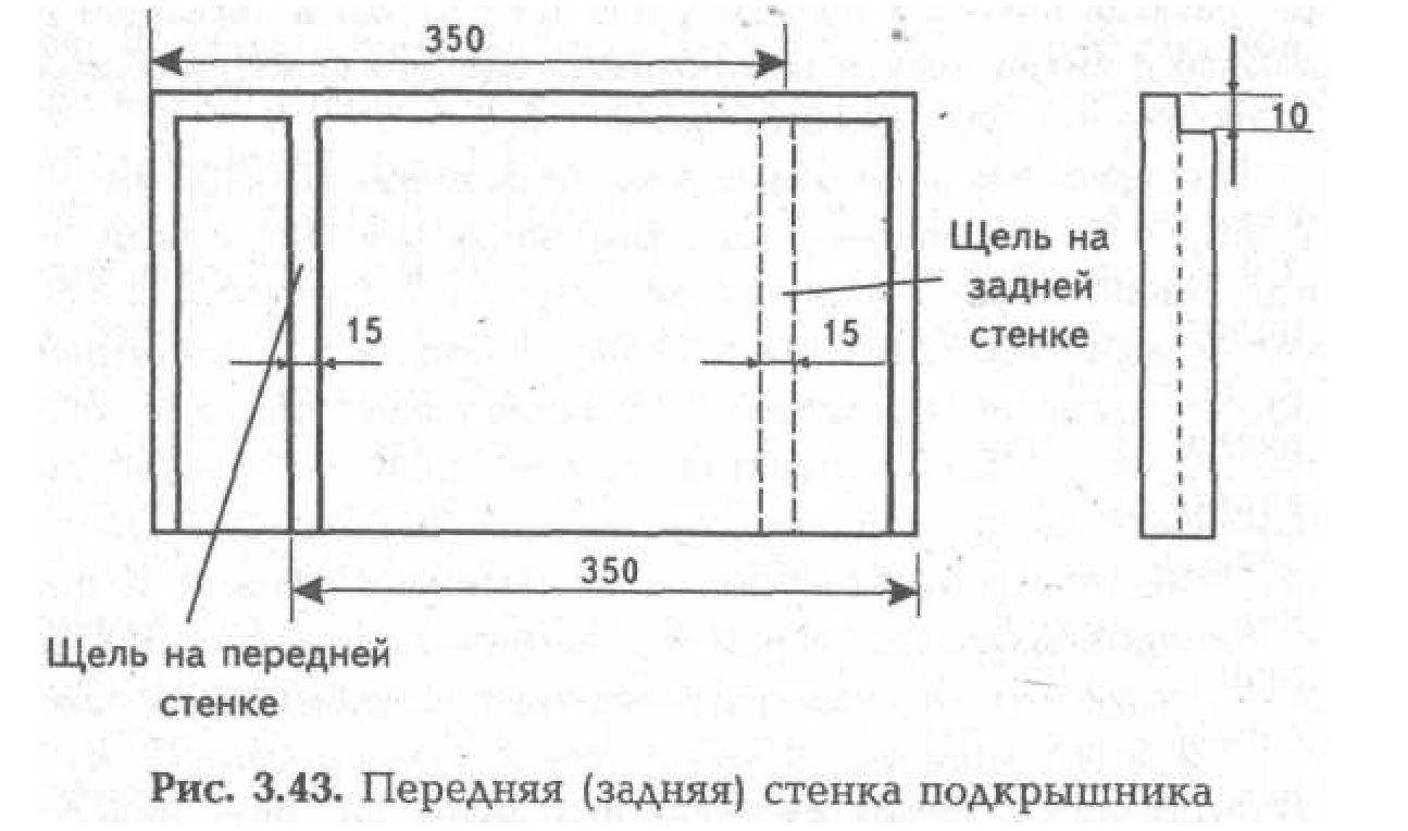 Ще рекомендую в передній і задній стінках подкрыш-ника вгорі вибрати паз 10x10 мм, а також вибрати щілина 15x10 мм (мал. 3.43). Ці щілини повинні розташовуватися друг проти друга в зібраному подкрышнике. Про їхнє призначення буде сказано нижче.