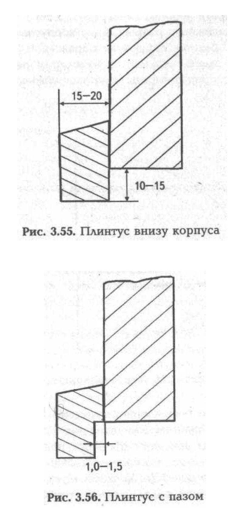 Питання надійного розєднання корпусів при наявності плінтусів я вирішив у такий спосіб. У плінтусах на передній і задній стінках на деякій відстані від кутів корпуса роблю вирізи до рівня нижнього зрізу корпуса (мал. 3.57).