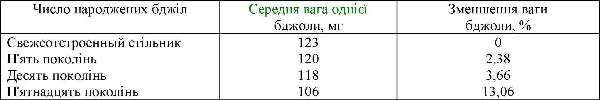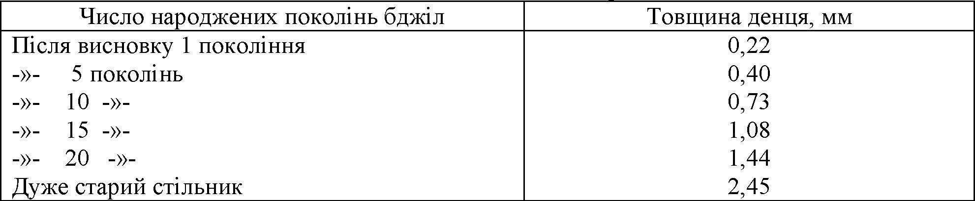З таблиці видно, що з кожним висновком поколінні бджіл і трутнів іде стовщення осередків, а отже відбувається зменшення їхнього обсягу.