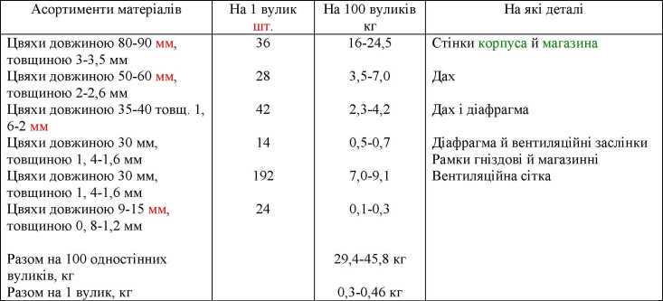 Кількість матеріалів для виготовлення 12-рамкового вулика