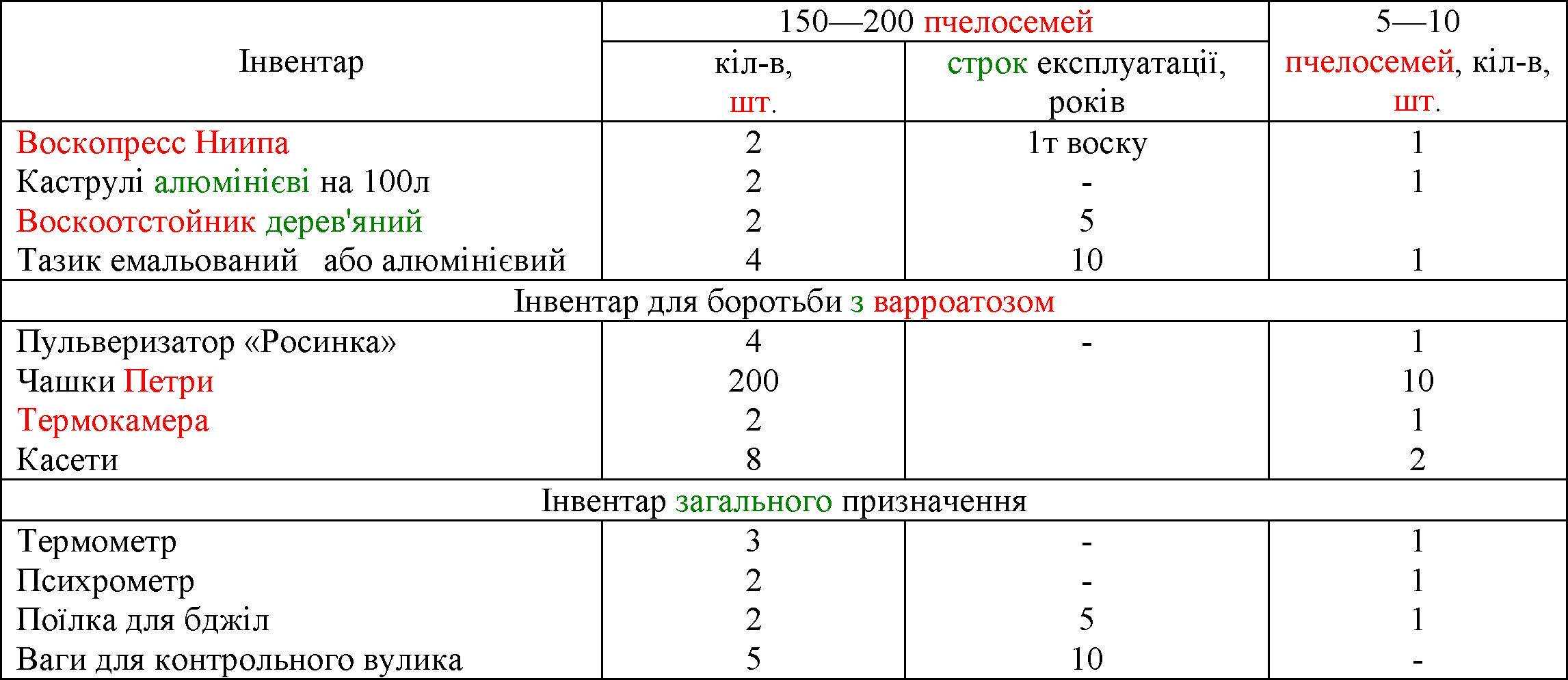 Для пасіки потрібно багато різноманітного інвентарю і якщо не враховувати термін служби того або іншого предмета, з безгосподарність обернеться високою собівартістю продукції. У таблиці 14 приводяться зразкові норми й терміни служби інвентарю для пасіки в 150-200 і 5-10 пчелосемей.