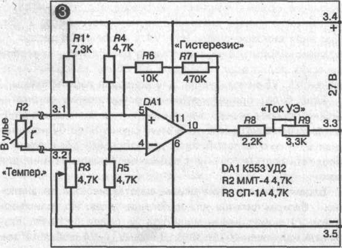 Блок терморегулювання зібраний на мікросхемі ДО553УД2. Термочувствительным елементом (термодатчиком) є термоопір R2 4,7 кому типу ММТ-4, що міститься в один з вуликів над поверхнею підігрівника під низ рамок.